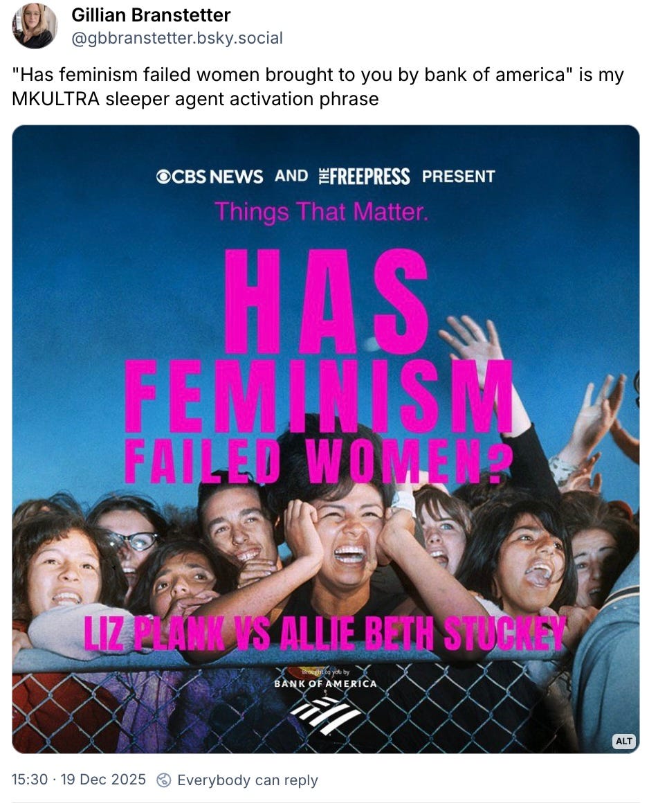 Back to the topic of backlash, there is a disconcerting trend of mainstream media in the US holding debates over whether feminism has been bad for women, or work, or the world in general. Jessica Valenti has written an essay about this, which opens with the fact that CBS is holding a Bank of America-sponsored debate titled: “Has feminism failed women”. The implication isn’t that feminists have not fought hard enough for equality, but that the very aims of feminism were mistaken from the start. Valenti says she has declined numerous invitations to such panels recently “because to participate would be accepting the premise that our rights and humanity are up for debate. Once you concede that it’s reasonable to ask whether women’s rights are a good thing, you’ve already lost.” Something to keep an eye on in 2026.
